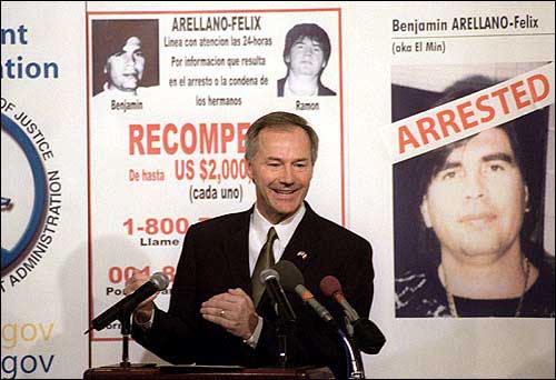 U.S. Drug Enforcement Administrator Asa Hutchinson explains at a news conference in Washington details of the arrest of drug trafficker Benjamin Arellano Felix. Soldiers raided a house in central Mexico early Saturday and captured Felix, alleged leader of Mexico's bloodiest drug cartel.