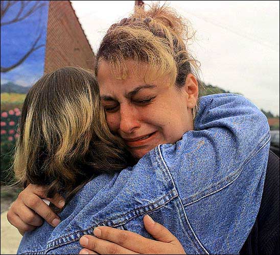 Glenda Presnell cries while hugging her friend, Betty Davis, before going inside the Mitchell County Courthouse to retrieve some photographs and letters. The items belonged to her husband, Jeremiah Presnell, 20, who was one of eight inmates to die in an overnight fire Saturday at the county jail in Bakersville, N.C.