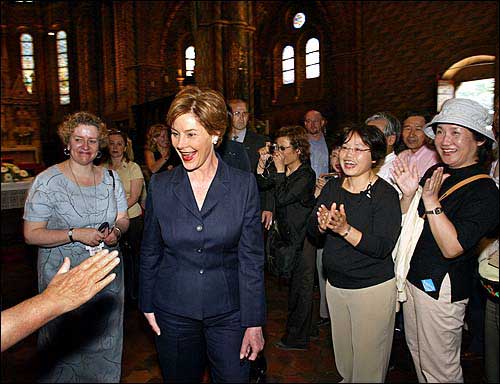 First lady Laura Bush is applauded by dozens of international tourists while visiting the St. Matthias Church in Budapest, Hungary. Later Saturday, Mrs. Bush moved on to Prague, Czech Republic, the last stop on her European tour. Mrs. Bush used the tour to speak out on issues of importance to her including defense of the president.
