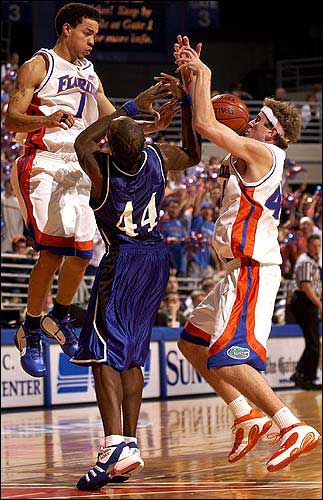 Florida's Matt Walsh, right, knocks the ball away from Henry Domercant (44) of Eastern Illinois as Florida's Anthony Roberson watches. Florida won Thursday's NIT contest at Gainesville, Fla.