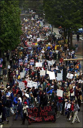 Anti-war protesters march through the streets of downtown Portland, Ore. An estimated 5,000 protesters peacefully demonstrated their stance against war with Iraq on Saturday.