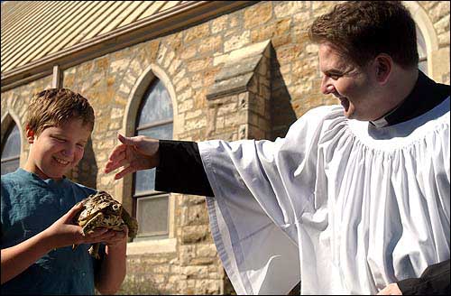 Ian Babcock, 12, Lawrence, holds out his leopard tortoise, Deronimus, for a blessing and a prayer by the Rev. Jonathon Jensen during a St. Francis of Assisi celebration at Trinity Episcopal Church, 1011 Vt. Sunday's event also attracted dogs, cats, a rooster and a snake.
