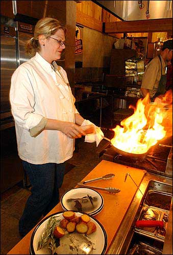 Janna Traver, a Kansas University graduate and Lawrence resident, fires up a brandied demi-glaze to finish off a peppered elk chop at Cabela's.