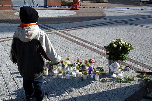 A boy looks at flowers and candles in front of the mall where a bomb exploded in Vantaa, Finland. The blast Friday night killed seven people and injured 59 others. It occurred near the spot where a clown had been inflating balloons for children moments earlier.