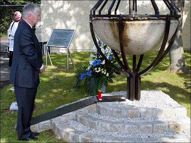 Germany's Interior Minister Otto Schily observes a minute of silence at the memorial site for the victims of the terrorist attack at the 1972 Olympic Games in Munich. The observance was Friday at the military air base in Fuerstenfeldbruck, south of Munich. Eleven athletes from Israel and one German police officer were killed in the terrorist attack.