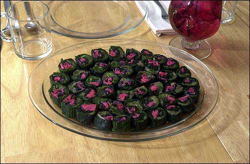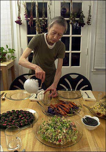 A recent meal at her home featured: rolled greens (red mustard leaf around frisee, red kale and pickled radish); carrot nishime (lightly cooked carrots, red cabbage, onion and sunflower seeds); short-grain brown rice, millet, fresh corn and black sesame seeds; chick pea and vegetable salad; miso soup with leeks, squash, mung beans and chives; crepes filled with amazake (a cream sauce made from sweet brown rice); and roasted barley tea.