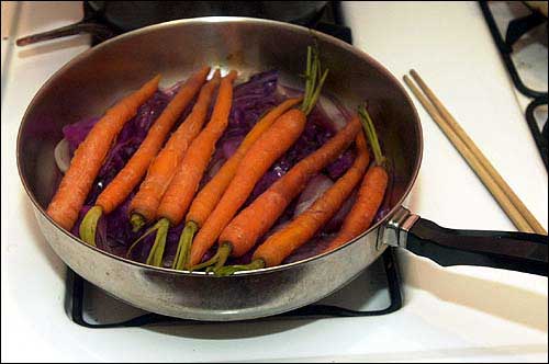 Carrot nishime is a macrobiotic dish that contains carrots, red cabbage, onions and sunflower seeds cooked in a small amount of water.