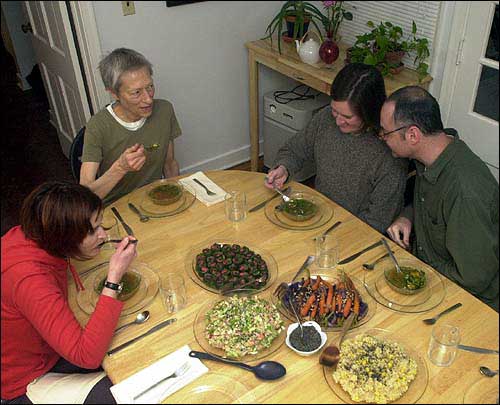 Carole Boggs, a Kushi Institute-trained macrobiotic practitioner, sets the table for a recent Club 1039 dinner party. The menu features, clockwise from left, rolled greens; carrot nishime; a dish of short-grain brown rice, millet and fresh corn; black sesame seeds; and chick pea and vegetable salad.