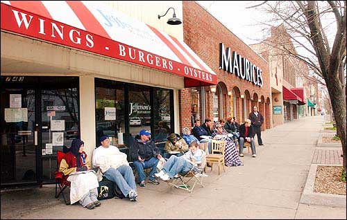 Kansas University students Beth Hickey, of Canada, and Colin Dutton, of Lawrence, are first in line at Jefferson's Restaurant, 743 Mass. They began waiting for a table at 7 a.m. Monday, so they could watch the Jayhawks play Syracuse in the Final Four game Monday night at the restaurant.