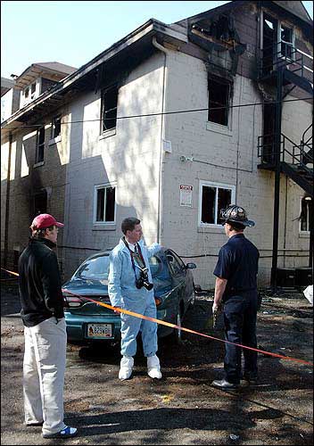 Darren Lundgren, left, of St. Louis, talks with an investigator and a firefighter about damage to his bedroom and belongings outside his residence near Ohio State University. A fire killed five students and injured three others Sunday at the house in Columbus, Ohio. Lundgren was not home at the time the fire started.