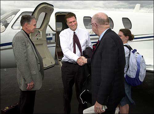 Kansas University interim athletic director Drue Jennings, left, looks on as KU Chancellor Robert Hemenway, second from right, greets Illinois basketball coach Bill Self, center, who arrived with his family, including daughter Lauren, right, at Lawrence Municipal Airport. Though Hemenway and Jennings declined comment on the matter Sunday when Self arrived, a news conference has been scheduled today to introduce Self as the next Kansas men's basketball coach.