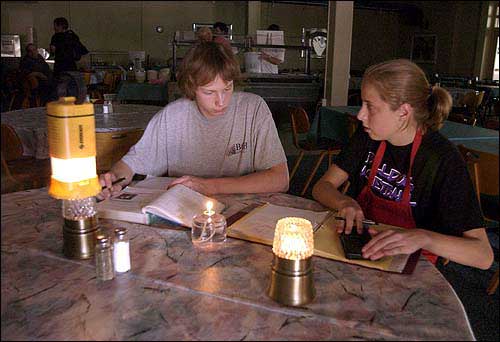 Baldwin High School students Daniel Beuthien, 17, left, and Anna Gillispie 17, do school work by candlelight in Baker University's cafeteria, where they hold after-school jobs. A transformer malfunction Tuesday afternoon knocked out power across the Baker University campus in Baldwin. Electricity was restored about four hours after the blackout began.
