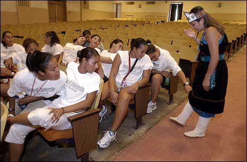 Haskell Indian Nations University women's volleyball team members inspect Miss Haskell Shawna Douma's regalia as they wait for the start of the school's convocation in the Haskell Auditorium. An air-conditioning malfunction Tuesday in the auditorium sent temperatures soaring inside and caused postponement of the annual event.