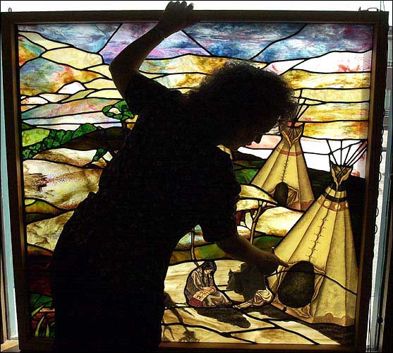 Stained-glass artist Nancy Fricker cleans one of five panels depicting the Flint Hills at Rayer's Bearden Stained Glass Supply in Wichita. The panel will be part of a 22-foot-long mural to be installed this week in Bill Kurtis' Art of the Prairie Gallery in Sedan.