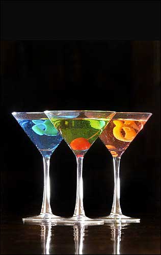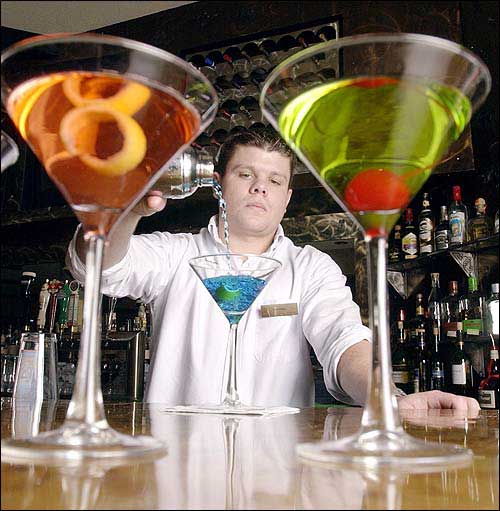 Framed by a Cosmopolitan and Apple Sour Martini, bartender Chris Patton, Lawrence pours a Tropical Martini at Marisco's Bar & Grill, 4821 W. Sixth. Bartenders say customers are asking for flavorful martinis and cocktails this holiday season.