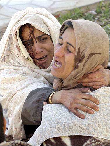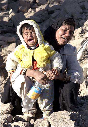 A mourning Iranian mother and her child cry for their families who were killed in a destructive earthquake in Bam, Iran. The devastating 6.5-magnitude quake struck at 5:28 a.m. Friday, an hour that found almost all of the city's 80,000 residents in their beds on the Muslim day of rest.
