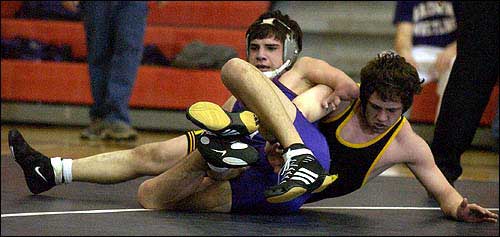 Baldwin sophomore Andreas Brandenberger, left, wrestles Paola's Paul Oliphant during last week's double dual in Eudora. Brandenberger lost, 21-6, to Oliphant, ranked fourth in Class 4A by the Kansas Wrestling Coaches Assn. Despite the score, Oliphant was relieved the challenging match was over.