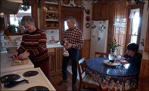 Andreas Brandenberger's mother, Christine, left, and his father, Bill, prepare a salad for dinner in their home west of Baldwin.