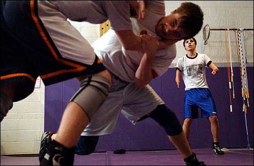 During wrestling practice at Baldwin High, Andreas Brandenberger, background, waits for his chance to wrestle. Brandenberger, who was born with phocomelia, a birth defect that left him with undeveloped arms, hopes to reach the Class 4A state wrestling tournament this year.