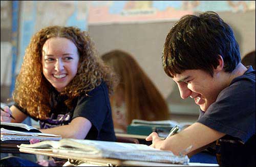 Andreas Brandenberger and freshman Annie Parr laugh during Spanish class at Baldwin High. Brandenberger, who wrestles for the Bulldogs, can type, write easily and swim, but soccer is his favorite sport.