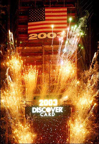 New York ? With a sing-along and a party befitting Superman, hundreds of thousands of revelers gathered to watch the glimmering Times Square ball drop, heralding the arrival of 2003.