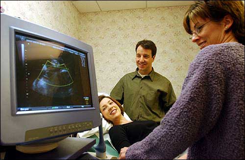 Paul and Shawna Gisi, Lawrence, look at an image of their baby boy with the help of sonographer Gayle Franklin. The technology behind Three-Dimensional Ultrasonography creates a more realistic image than ever for expectant mothers and their partners.