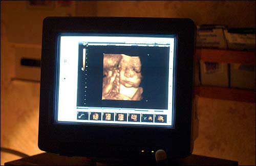 The Gisi baby, in his 37th week of gestation, is shown on the monitor via 3-D ultrasound.