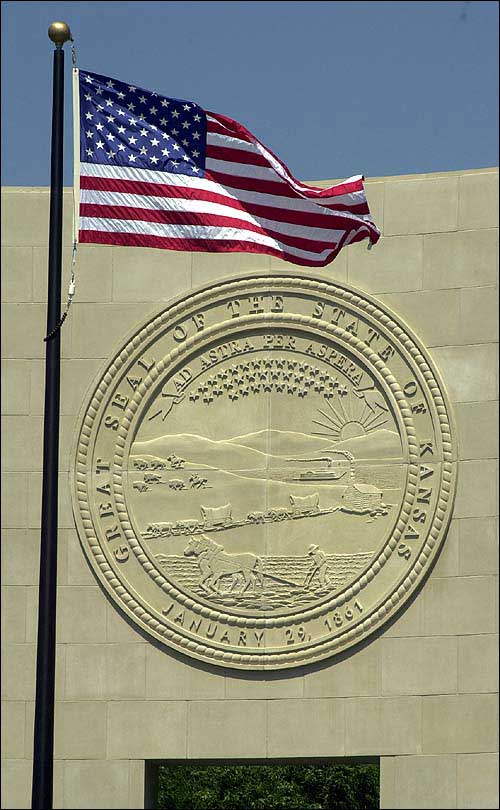 The state seal features a farmer and plow, buffalo, a cabin, steamship and the state motto, “Ad astra per aspera,” Latin for “To the stars through difficulties.”