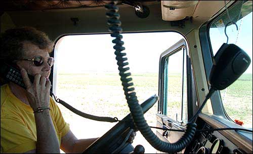 Donna Schwindt, 72, talks on a cell phone to her boss. Schwindt drives an 18-wheeler for A&H Farms of Colby. Although Schwindt just finished her last days behind the wheel for wheat harvest, she plans to return to the driver's seat for the fall corn harvest.