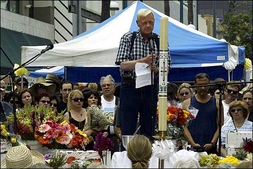 Standing before flowers, photographs of the victims and letters to the victims’ families, several dozen people listened as Rev. Janet Bregar of the Santa Monica Bay Interfaith Council read an American Indian “prayer for entering the day.”