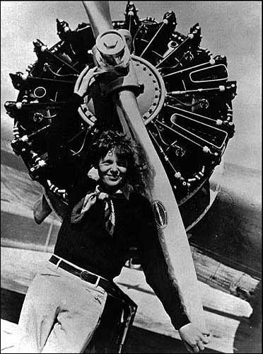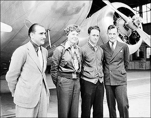 Amelia Earhart, 40, stands next to a Lockheed Electra 10E, before a flight from Oakland, Calif., to Honolulu, the first leg of her record-setting attempt to circumnavigate the world. Earhart and navigator Fred Noonan crashed in the Pacific Ocean July 2, 1937.
