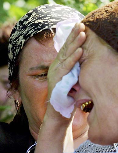 Chechen women mourn victims of an apartment house explosion, in the Chechen capital, Grozny. An explosion ripped through an apartment house early Friday, killing 11 people, officials said.