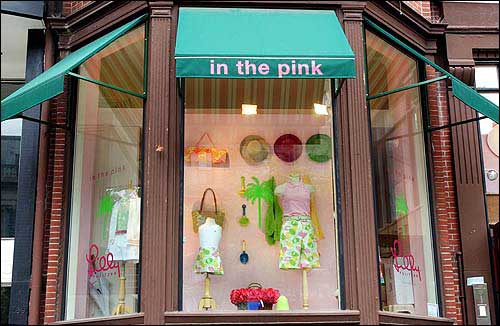 This is a view of a retail clothing store on Newbury Street in Boston which features the trademark colorful Lilly Pulitzer fashion line, made famous in Florida in the 1960s.