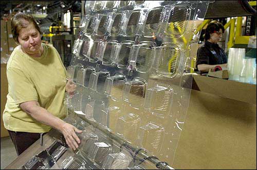 Nancy Wagner, quality control employee at the Wilkinson Manufacturing plant in Fort Calhoun, Neb., checks plastic containers made of corn plastic as they come out of the forming machine. The nation's abundant corn supply is being converted into environmentally friendly plastics and fibers for use in products ranging from mattress pads to golf shirts.