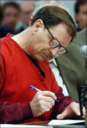 Gary Ridgway signs papers signifying that he is pleading guilty to 48 counts of aggravated first-degree murder in the Green River killings, in front of Judge Richard A. Jones in Seattle.