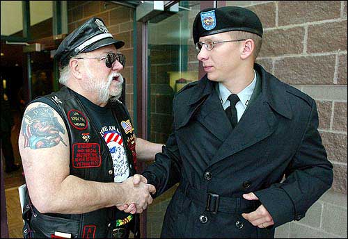 Army Pfc. and former POW Patrick Miller, right, talks with Vietnam veteran Fred Becker after a Veterans Day memorial at Fort Richardson in Anchorage, Alaska. Miller attended the ceremony Tuesday. Miller was captured March 23 when his 507th Maintenance Company was ambushed near Nasiriyah in Iraq. His Iraqi captors later released him and other members of his company.