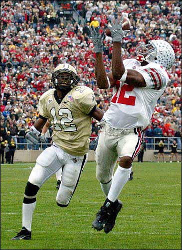 Ohio State wide receiver Michael Jenkins, right, makes the go-ahead touchdown reception over Purdue's Antwaun Rogers in the fourth quarter of last year's game. The touchdown catch gave then-No. 3 Ohio State a 10-6 victory Nov. 9, 2002 at Ross-Ade Stadium in West Lafayette, Ind., preserving an 11-0 record and moving the Buckeyes to No. 1 in the BCS rankings.