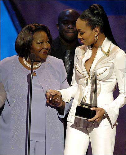 The award for Favorite Male Artist-Hip-Hop/Rhythm & Blues Music was presented to Mary Vandross, left, by singer Monica during the 31st annual American Music Awards in Los Angeles. Luther Vandross, who was unable to attend Sunday's ceremonies to pick up the award, is recovering from a debilitating stroke.