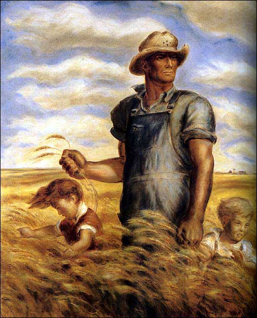 A well-muscled farmer stands in a an ocean of wheat, clutching a few stalks in his hand. Behind him, a couple of wind-blown children play against the backdrop of a cloudy sky.