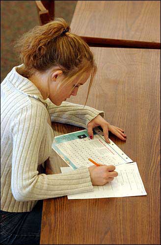 Perry-Lecompton sophomore Cheyanne Morris, 15, takes a test Thursday morning at the school. Recently the school has taken on a new policy that all students -- starting with this year's freshman class -- will have to pass reading and math exams to graduate.