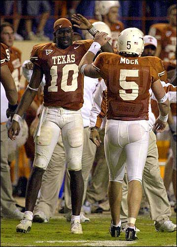 Texas freshman quarterback Vince Young, left, congratulates junior quarterback Chance Mock (5), who engineered the final touchdown in their 43-40 victory over Texas Tech. Mock came off the bench in the victory Nov. 15 in Austin, Texas.