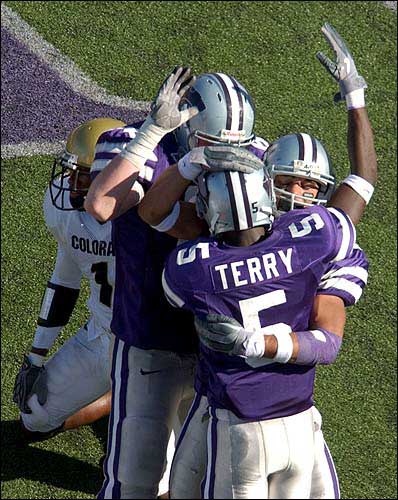 Kansas State's James Terry, front, is congratulated by Thomas Hill, left, and Antoine Polite after Terry caught an 8-yard touchdown pass. The Wildcats beat Colorado, 49-20, Saturday in Manhattan.