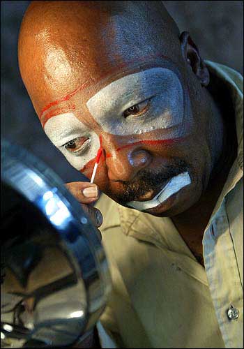 Backstage, a man puts on makeup in the corner of a semitrailer that has been converted into a dressing room. He transforms himself from 62-year-old Robert Dunn into Onionhead, the clown “from the ‘hood.”