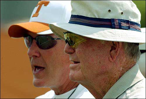 Texas coach Mack Brown, left, watches the Longhorns practice with former UT coach Darrell Royal. The Southwest Conference rivalry between Texas and Arkansas was at its peak when Royal led the Longhorns. Now nonconference opponents, the teams will meet again today at Austin.