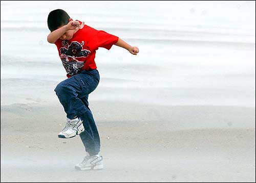 Jayme McFadden, 7, of Havelock, N.C., fights the wind and sand as he plays on Atlantic Beach. Despite a mandatory evacuation order, many people Wednesday refused to leave the North Carolina coast as Hurricane Isabel approached.