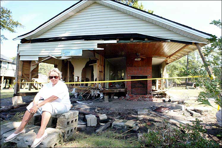 Mickie Braswell sits in front of the remains of her home in Kennels Beach, N.C. The home, which was purchased by her grandfather in the 1940s, served as a gathering point for five generations of family members until it was destroyed by Hurricane Isabel.