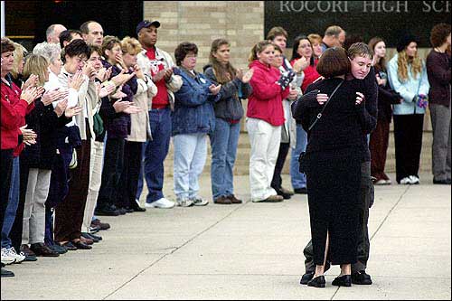 Adults line the sidewalk leading into Rocori High School as they applaud arriving students. Friday was students' first full day back at the Cold Spring, Minn., school after Wednesday's shootings that killed one student and left another injured.