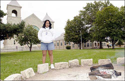Debbie Gilmore, a third-year elementary education major from Clera, Okla., stands near the fire circle at Haskell Indian Nations University. The fire was lit Monday to commemorate a student who was found dead during the weekend.
