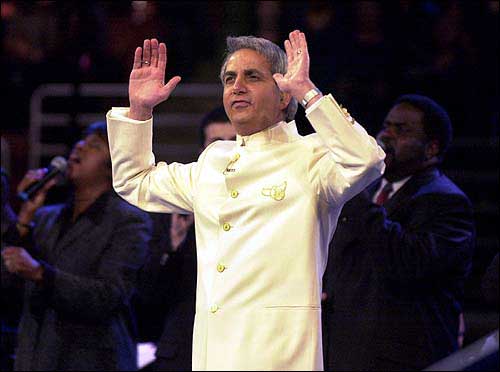 Hinn, a small man in a vanilla-colored Nehru jacket, stepped onto the stage to the frenzied delight of the audience, which had been fueling up on pizza and popcorn during their long wait.