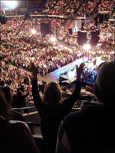 A WOMAN RAISES HER ARMS toward the ceiling during the Benny Hinn Good Friday service at Kemper Arena in Kansas City, Mo. Hinn's television show, This